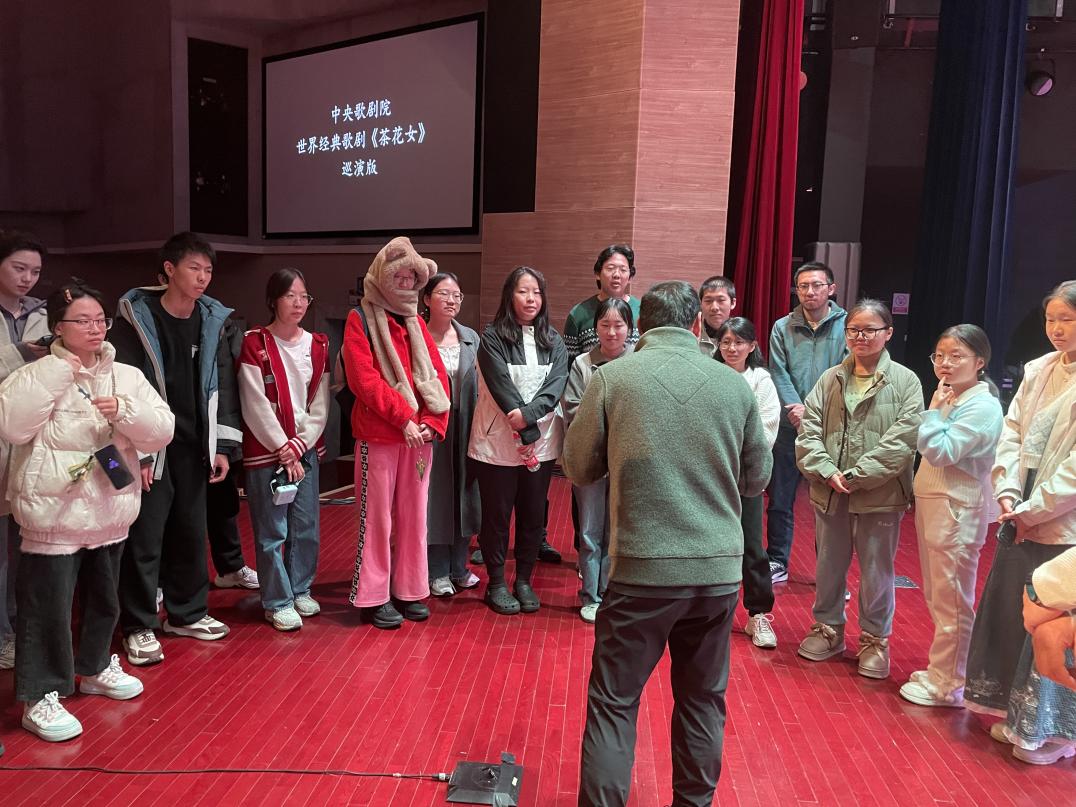 作为本次演出的特别策划环节,艺术教学中心携手中央歌剧院在演出前一日组织了一场别开生面的后台探班活动,20位学生代表获邀成为首批“尝鲜者”。活动现场,同学们围成一圈听主创们分享舞台背后的故事,在化妆室与主演们面对面交流互动;舞台上,演员们身着精致戏服进行全剧连排,指挥和演奏老师反复打磨细节,舞美团队调试着象征巴黎沙龙的精致布景与多媒体投影。一位参与探班的学生感叹:“第一次近距离看歌剧联排,还能跟主演们面对面打招呼,真是太幸运了!”