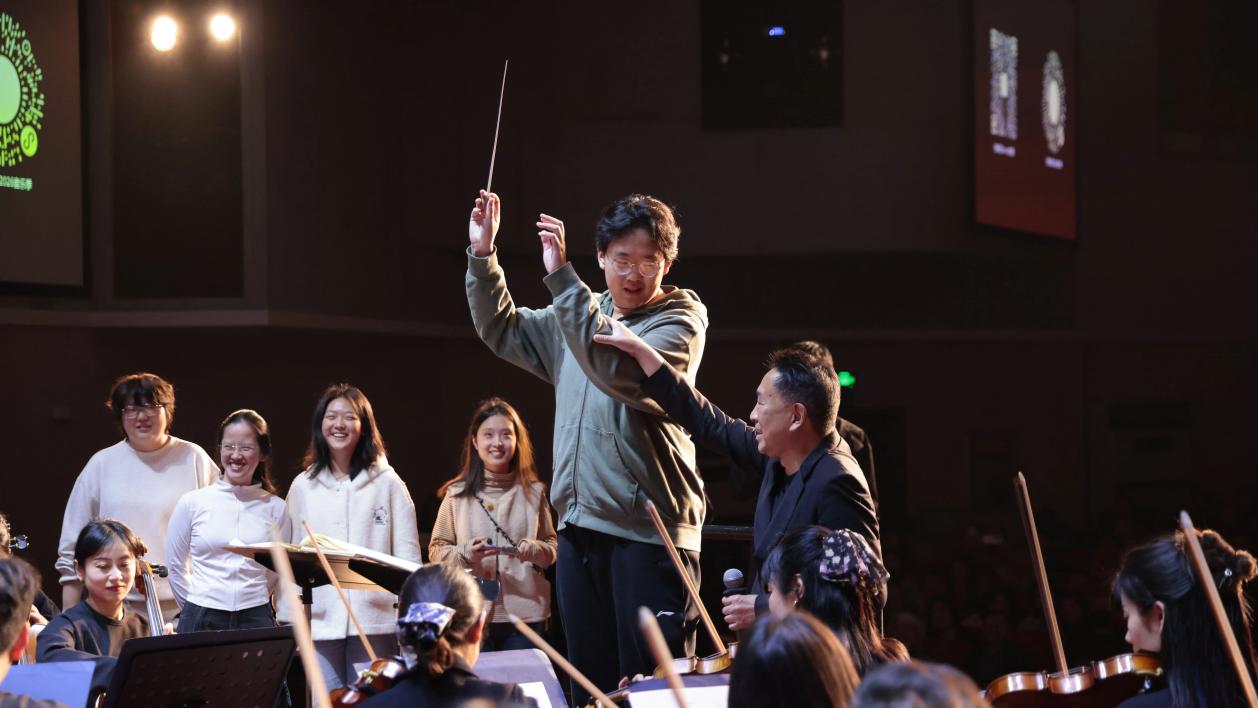 活动特别设置多个互动环节,让师生从“聆听者”变为“参与者”。在问答环节,同学们就小提琴的演奏特点、交响乐的欣赏方法等问题与胡教授深入交流,现场气氛热烈;听音识器互动中,同学们背对舞台仅凭听觉辨别乐器音色,在趣味中加深了对交响乐器的认知;在指挥体验环节,11位学生在胡教授的指导下轮流挥动指挥棒,亲身感受乐团“指挥”这一角色的魅力。