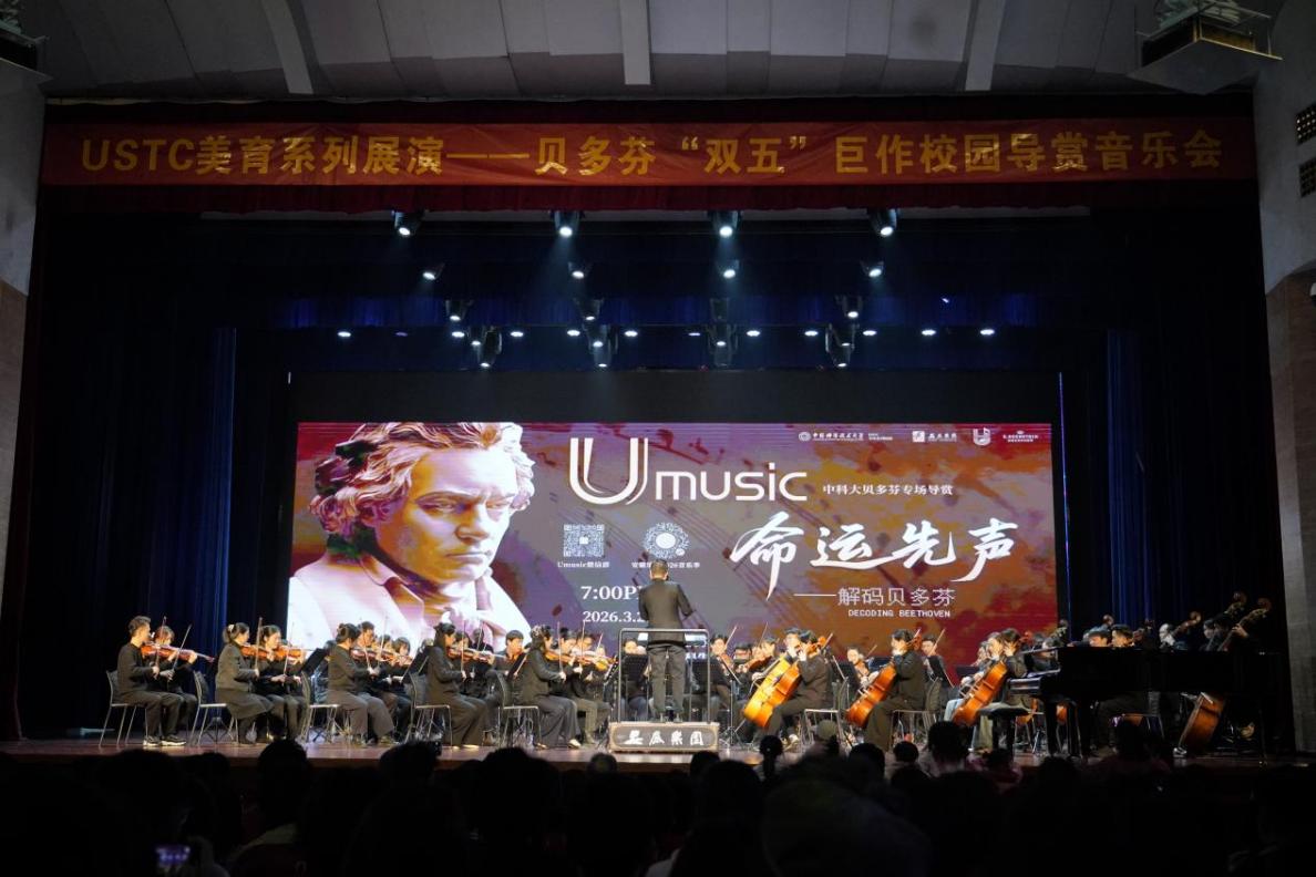 3月26日,“命运先声——贝多芬‘双五’巨作校园导赏音乐会”在东区大礼堂举行,安徽乐团交响乐团全阵容亮相。安徽省教育厅副厅长卢鹏,安徽演艺集团党委副书记、董事、工会主席李涛,安徽省文旅厅艺术处处长田冰凌,中共安徽省委宣传部文艺处副处长马其平,中国科学技术大学党委常委、校长助理薛天,教务处处长、本科生院副院长、本科生院办公室主任武晓君,校工会常务副主席杨晓果出席活动。